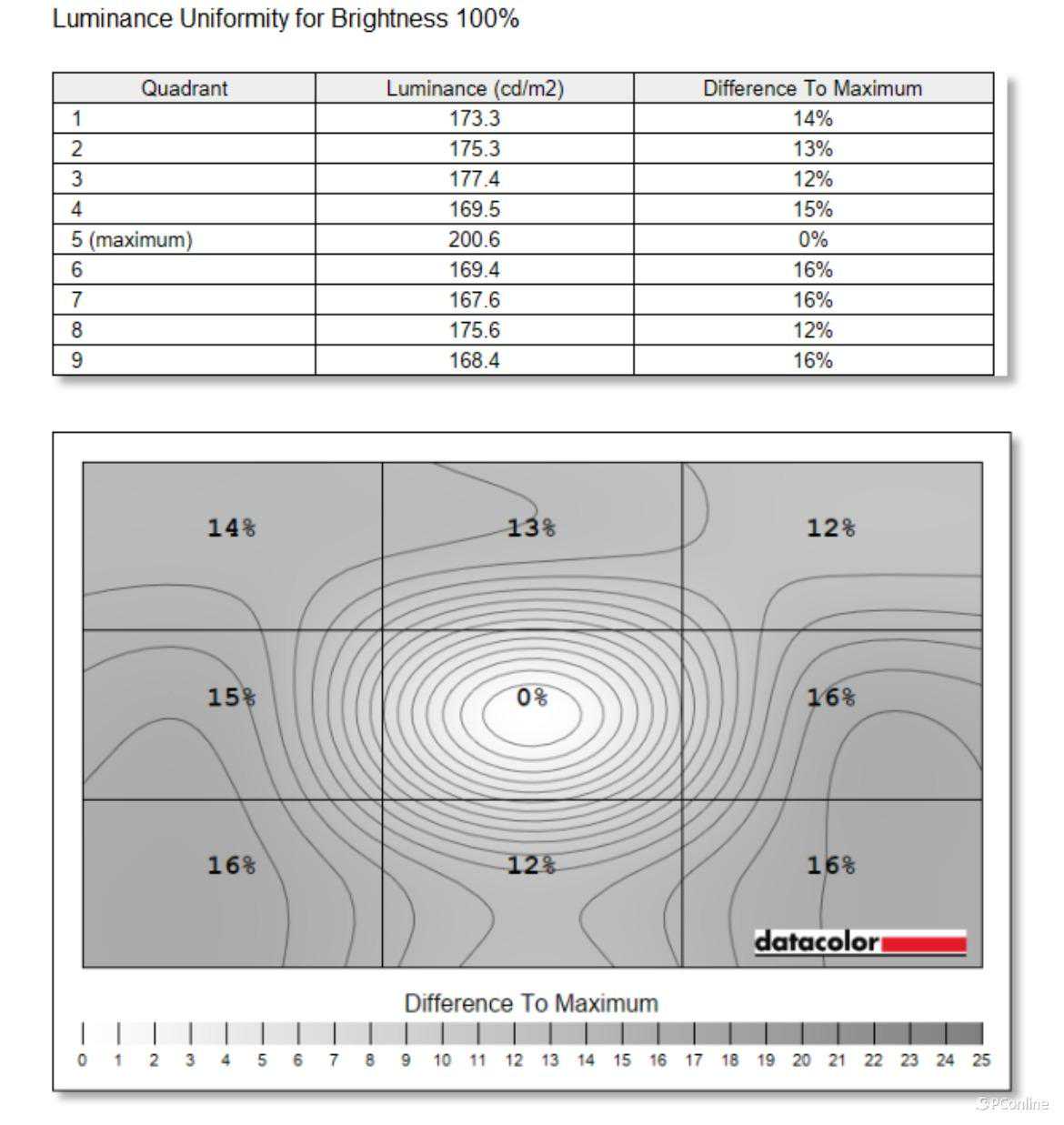 但HVA面板也不是十全十美,在面板均匀度方面,可能就稍微逊色一些,在亮度均匀性上,在100%测试亮度的情况下,VG253KM的面板四周都会出现超过10%的亮度差异,最大差值为16%,差距在30尼特左右,这个差距虽然可以被一些敏感的用户所察觉,但在日常使用中由于屏幕不是一直处于高光或者黑暗的情况,实际效果仍然可以接受。