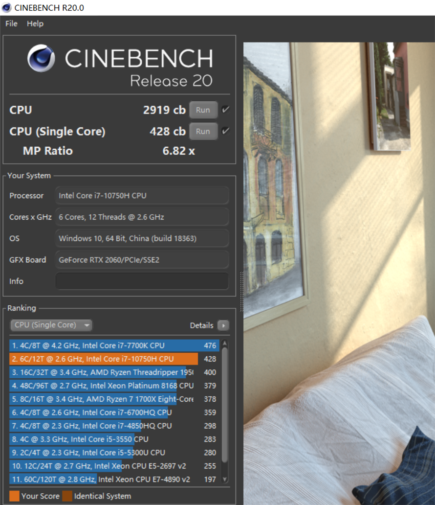在CineBenchR20的测试中,酷睿i7-10750H处理器单线程取得了428分,而多线程则为2919分,和英特尔i7-10750H相比,性能略有提升。