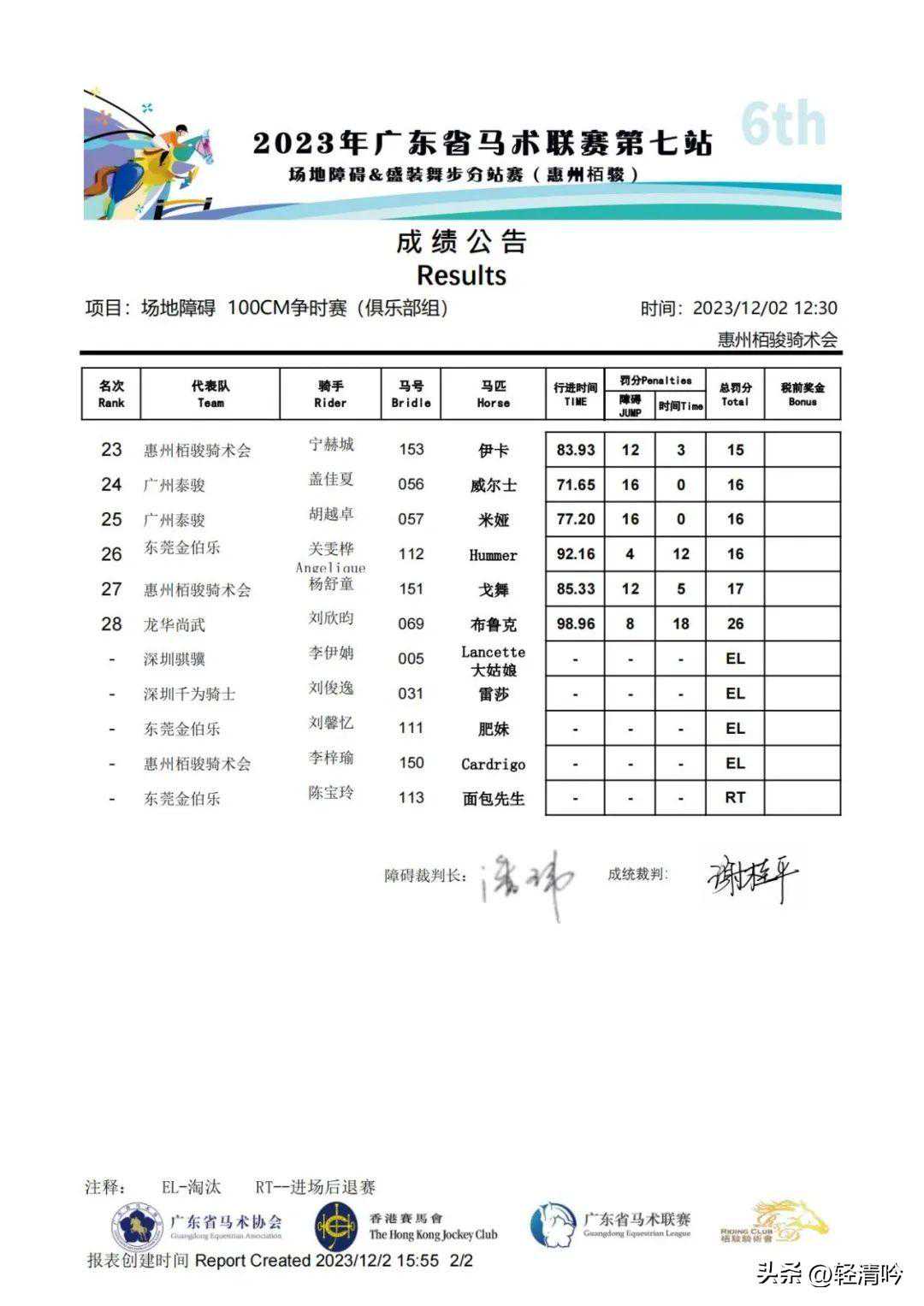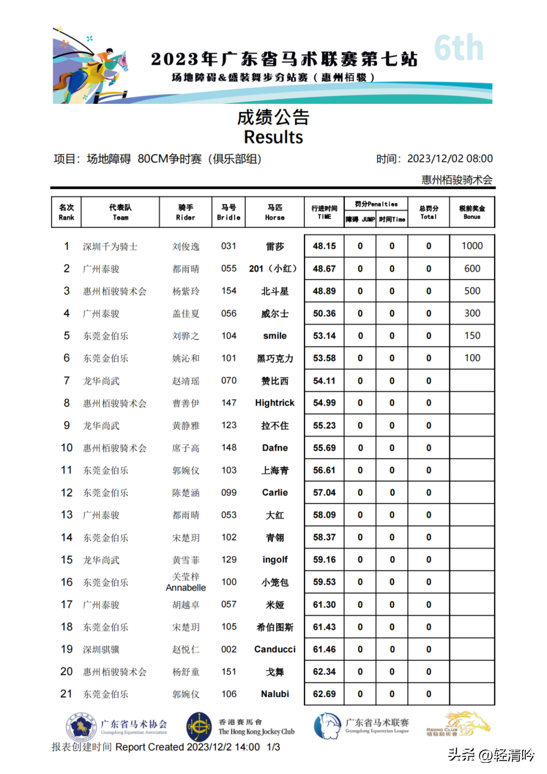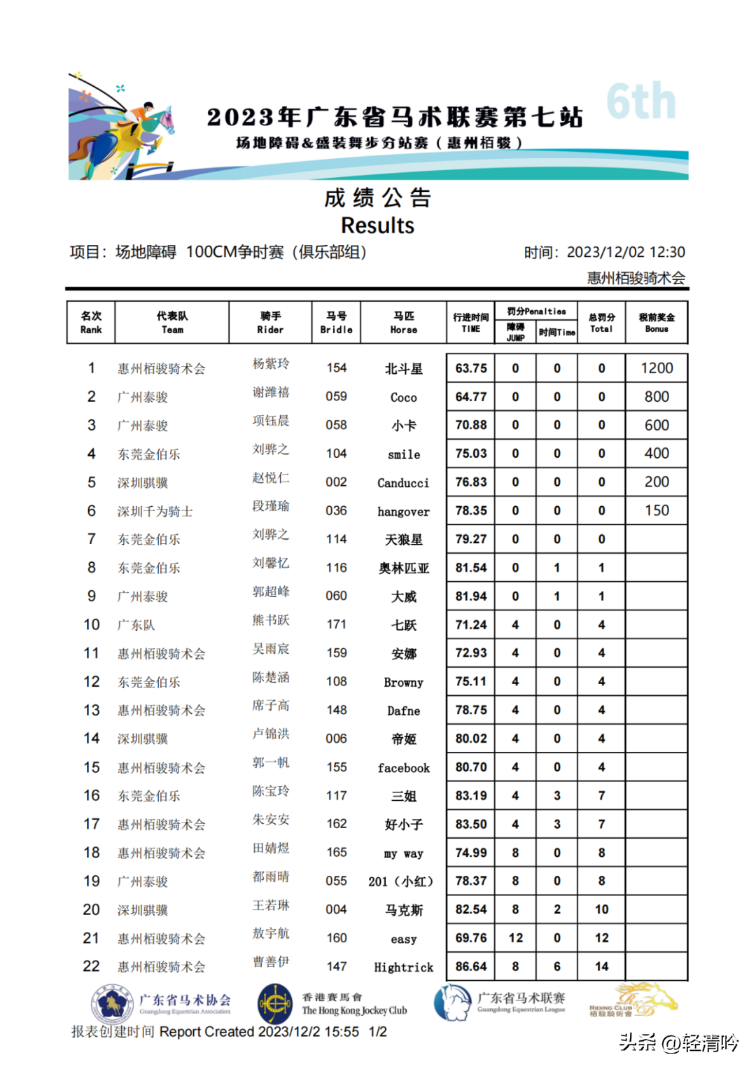 共有6对人马组合参加110CM级别两段赛,分别是项钰晨小卡、项钰晨DEJA(迪亚)、谢潍禧Coco、朱熙之Cola、李健聪小布和郭超峰大威。经过两轮的比拼,项钰晨小卡获得俱乐部组个人季军。