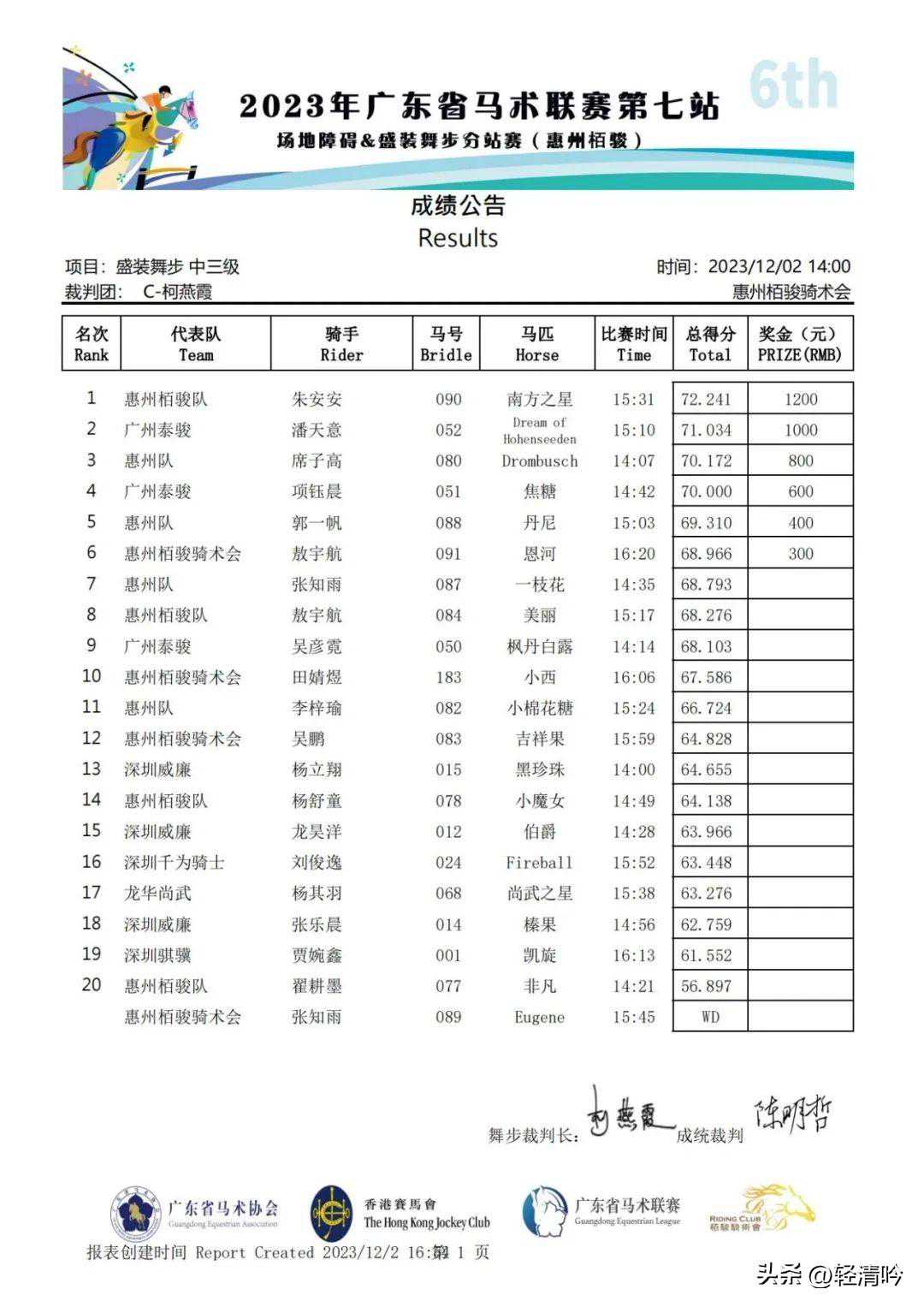 广州泰骏的潘天意策骑DreamofHohenseeden获得个人亚军,吴彦霓策骑枫丹白露获得个人第八名。