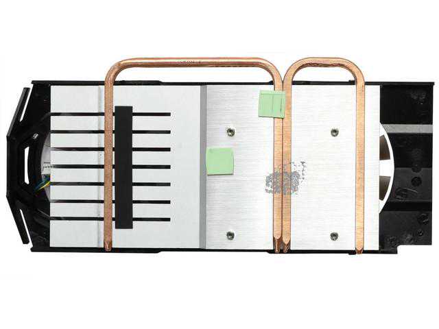 在显卡散热器的内部,则搭配了两根贯穿式的纯铜热管,从显卡GPU位置引出,贯穿整个散热器的两端,采用热管直触的方式与GPU无缝贴合,达到最快最有效的导热效能,能够快速将GPU温度经由热管均匀传导至整个散热片上,再由风扇风流倒出显卡之外。导热散热效能出色。