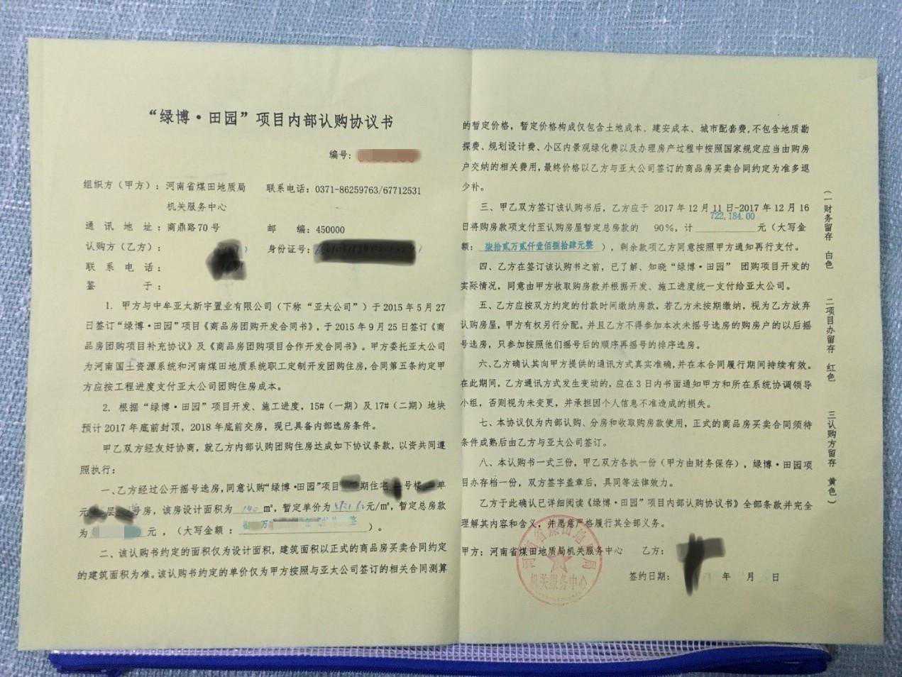 时间倒回到2013年,河南省自然资源厅、煤田地质局组织职工购买了位于郑州中牟绿博片区占地309.46亩(含保障房用地)的地块,并以定制模式合作开发商品团购住房项目,这就是“亚太绿博田园”项目最初的由来。也正是在2013年12月,张女士及员工第一次向煤田地质局缴纳“定金”。