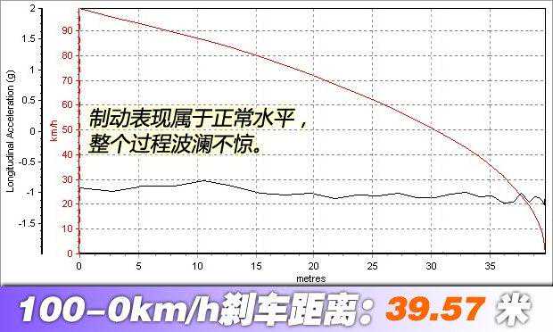 由于天籁的悬架调校优先考虑舒适性,所以在全力制动的时候支撑力稍显不足,点头的感觉较为明显。最终实测100-0km/h制动成绩为39.57米,属于正常水平,不算太出色。原因主要在于其仅配备了215mm宽的轮胎,成绩更出色的阿特兹配的是225mm宽度轮胎,一分钱一分货的道理。