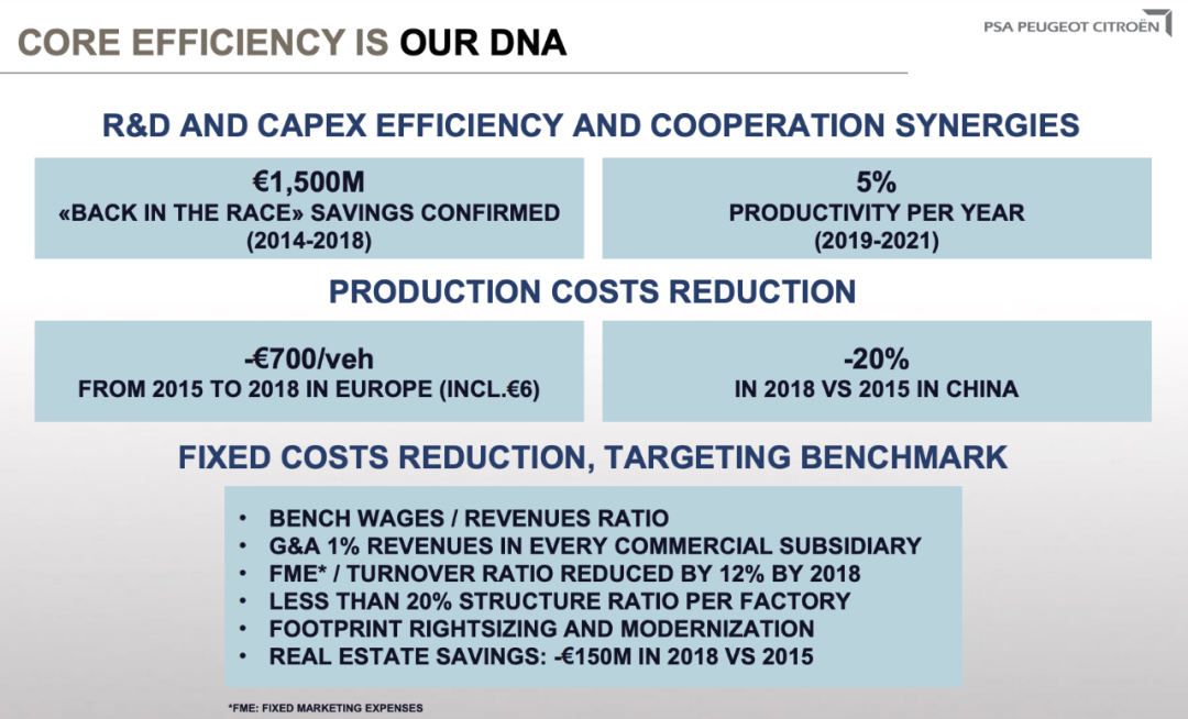 效率。效率被首次认定为PSA的DNA,其核心依然是降低生产和运营成本。其中包括:降低单车薪酬/收益比值、降低市场行销/消费转化率比值、减少工厂20%的结构性成本、调整以及更新降本措施、缩减场所费用。