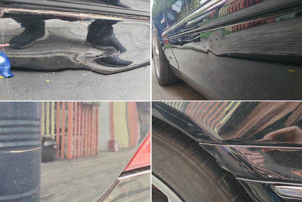 现在开始看车,绕着车瞅了一圈发现还是有很多瑕疵的。车身上存在多处划痕、凹陷,而且前后杠的缝隙明显不对,再看周围的还有飞漆的痕迹。