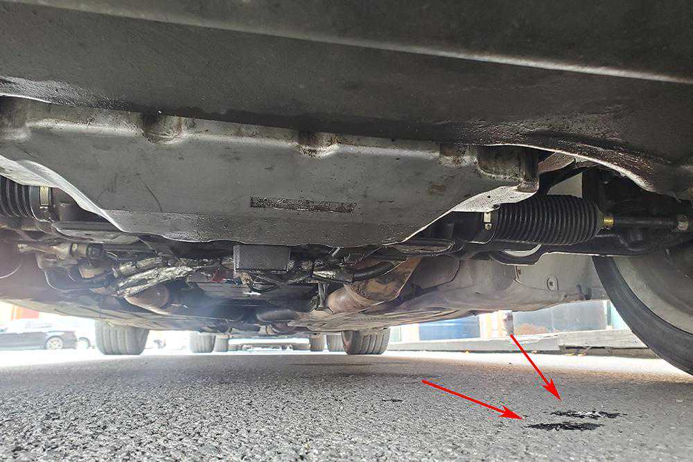 客户走出来的功夫包子趴下大致先看了一下底盘,全都是油乎乎的,除了排气管就没看到哪是没有漏油的。再看地上,停这儿还没三个小时吧就滴这么一滩了?