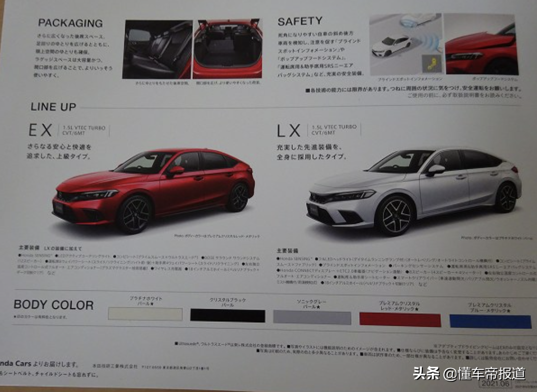 根据海外媒体曝光的信息显示,全新一代思域HATCHBACK在日本将提供LX、EX两个配置车型,每个配置均提供6速手动或CVT变速箱。