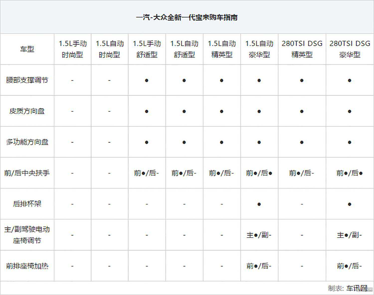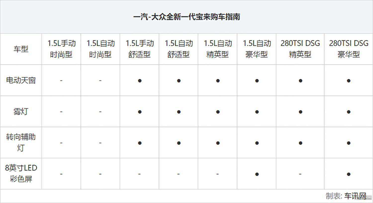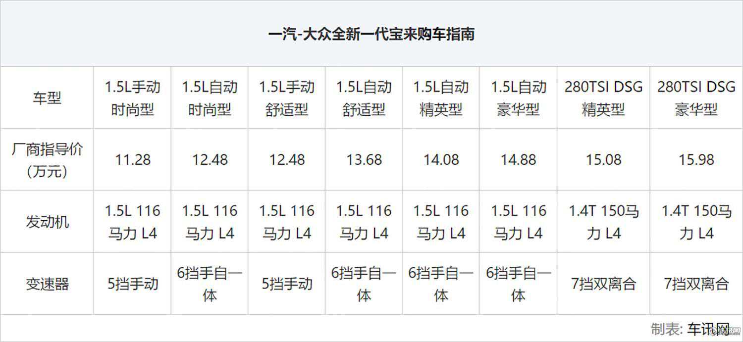 总结:全新一代宝来从性价比来看,绝对是强烈推荐1.5L自动精英型,毕竟最低配的两款车型配置确实很低,而顶配车型性价比又有所不足,虽然其动力确实提升较为明显,但是其价格也有一丝丝高的。另外,全新一代宝来的配置可以说是以四款为一个分割线,1.5L自动精英型仅比1.5L自动舒适型售价高了4000元,但配置却高了不少,无钥匙启动/进入、自动分区空调、后排出风口与主动刹车/主动安全系统皆有所配备,所以强烈推荐。当然了,土豪请直接购买顶配车型,毕竟顶配车型配置更加全面,动力也比1.5L车型更加强劲。