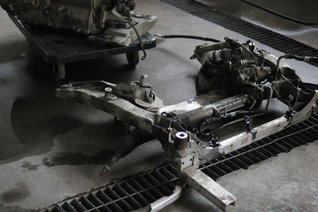 分解元宝梁、发动机,元宝梁上面挂了很多发动机漏的油渍。