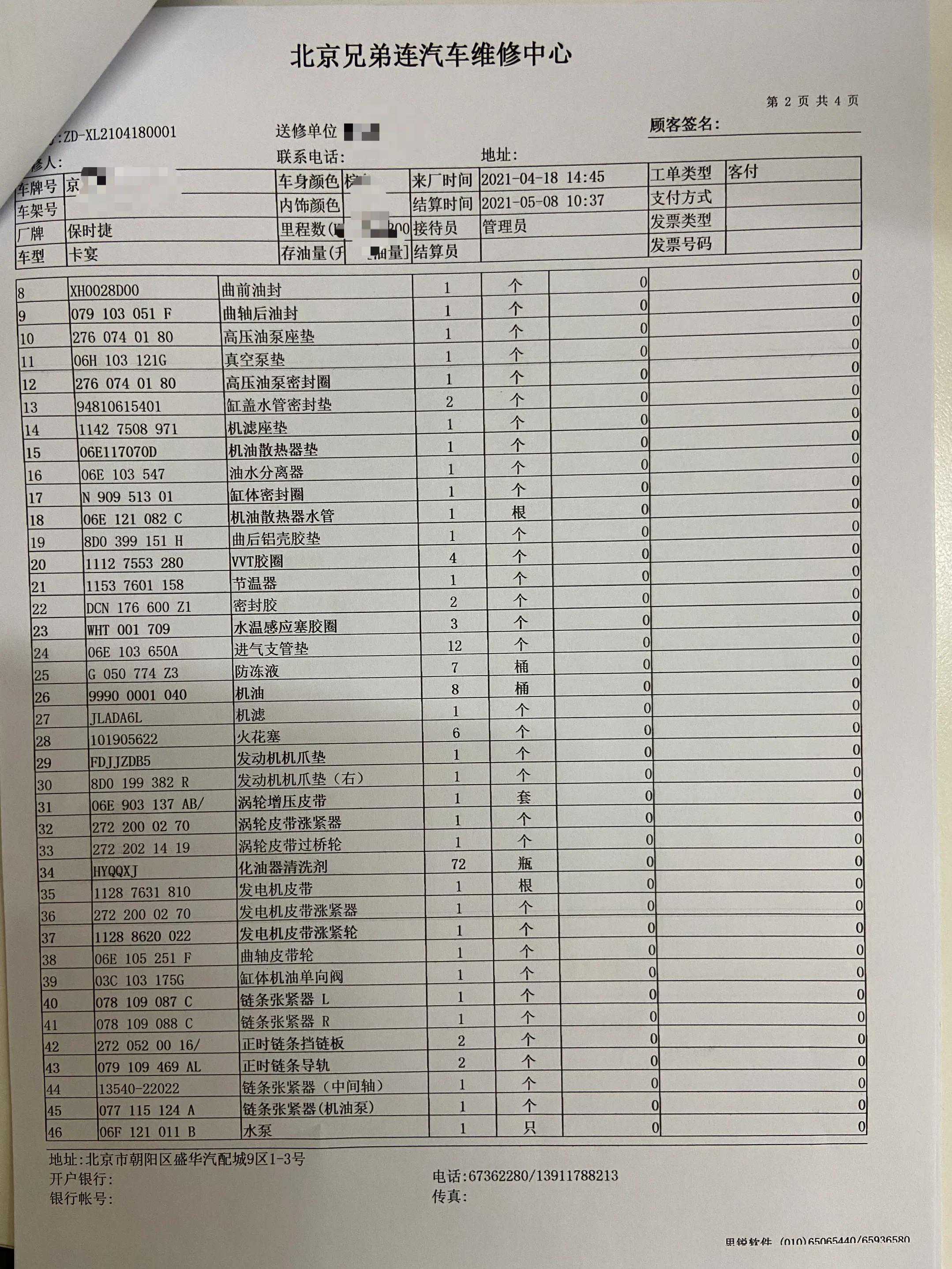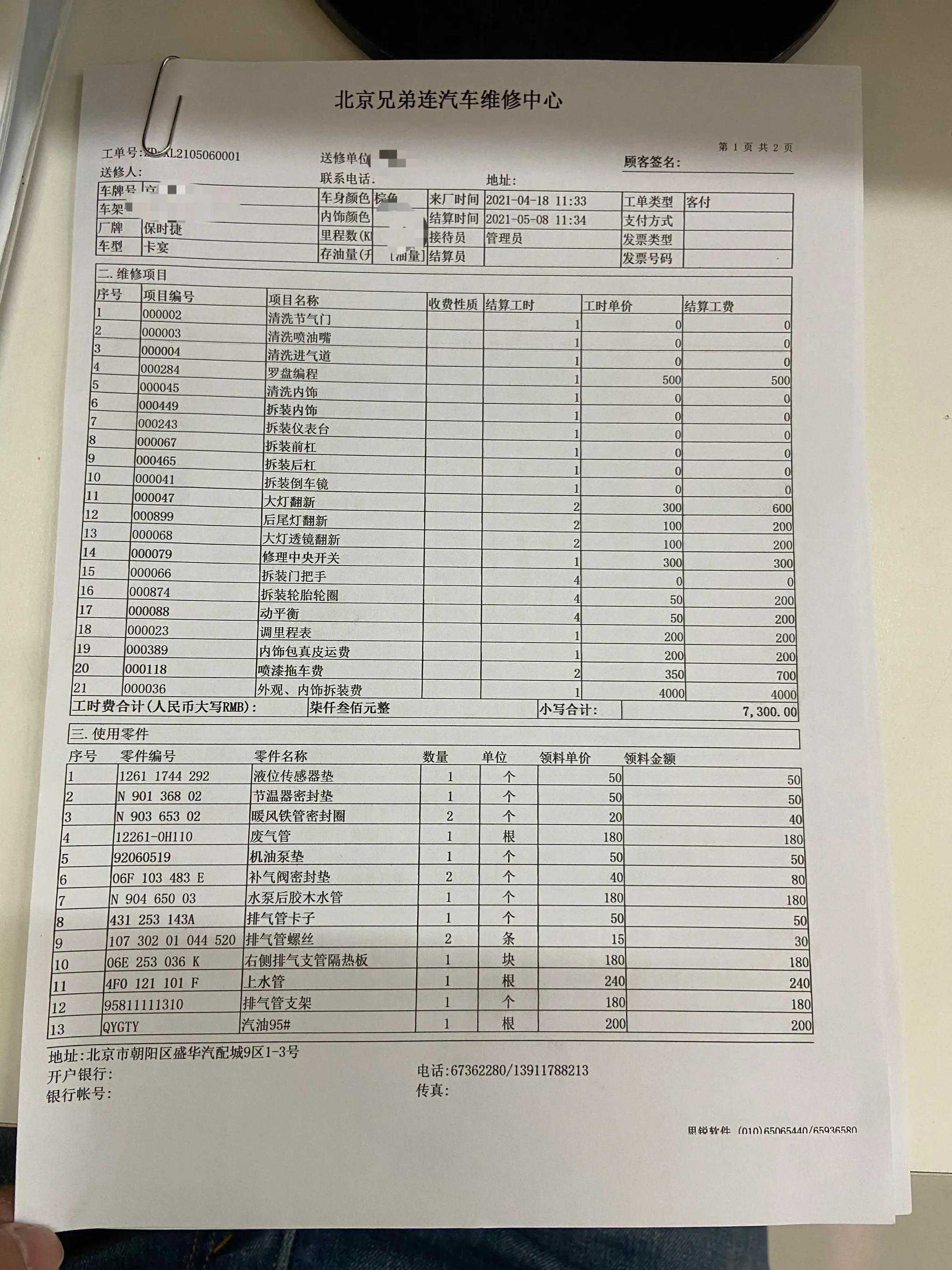 这五页的清单基本就是我这次整备的全部项目了。但这里边不包括座椅内饰的真皮包裹,轮胎轮毂。(这两项都是单独付给别人的)最后所有的花费我会合计列出。