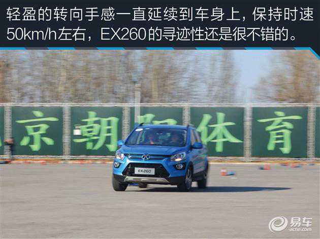 绕桩项目不算是SUV的强项,对于EX260也是如此。体验中,我将车速提升到50km/h左右通过,虽然能够感觉到EX260依旧非常受控,但缺感觉已经到了操控的极限。同时,出桩后的加速能力也比较的弱,不及常规动力车型。但在可控范围内的时候,EX260的转向表现很轻盈,也足够精准。车身的寻迹性也很不错,整个方向盘的转动力度比较轻。