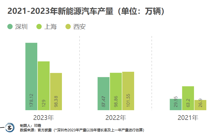 2023年,尽管深圳官方并未披露具体数据,但根据已公布的104.2%的增速,以及2022年的87.47万辆产量测算,其新能源汽车全年产量约为178.12万辆,远超西安(98.38万辆)和上海(129万辆)。