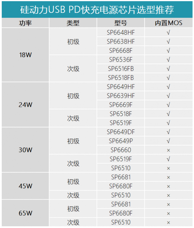 针对日益增长的消费类快充电源市场,硅动力充分发挥自身优势,推出了多款USBPD快充电源芯片,功率涵盖18W、24W、30W、45W、65W等多个级别,可以全面解决客户在快充电源芯片选型上的痛点。