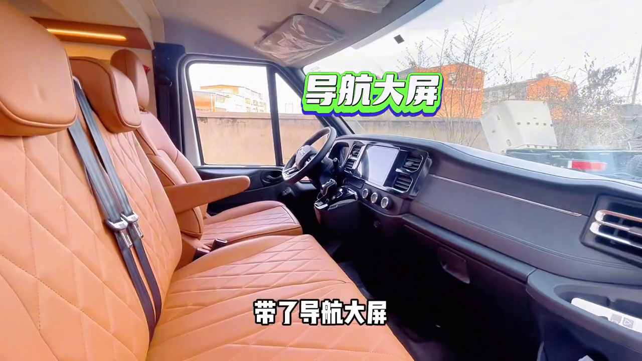 这个车上到驾驶室,驾驶室是带了多功能方向盘,带了一键启动,搭配的是2.0T8AT的变速箱,所以这个车开起来是比较顺滑的,带了导航大屏。该车是做了六座布局,前三后三的布局,后面是放倒的状态。
