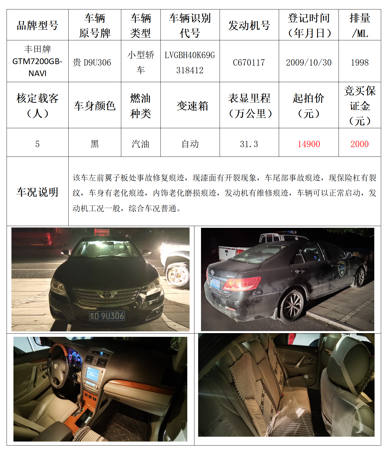 拍品编号2:丰田牌GTM7200GB-NAVI小型轿车一辆