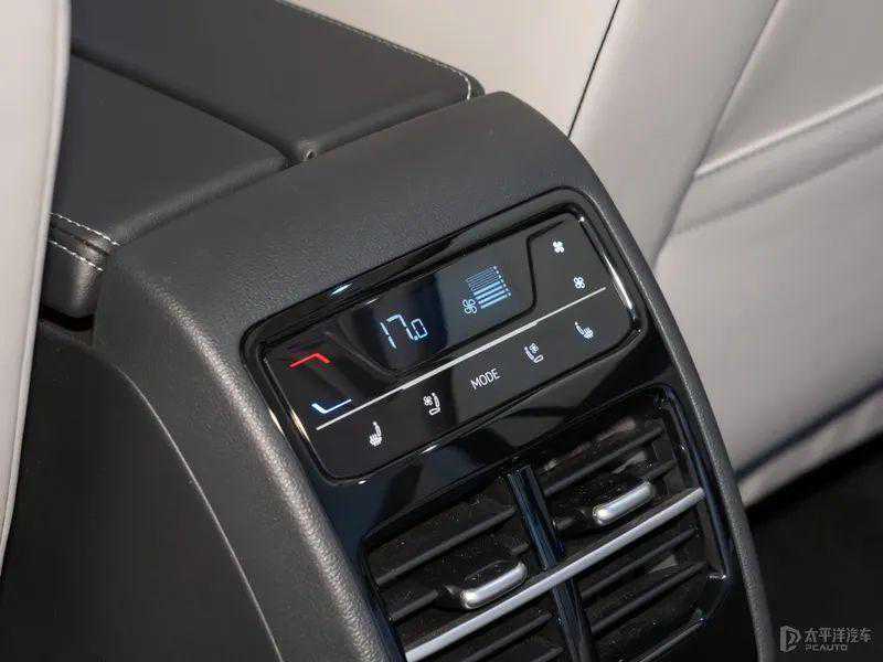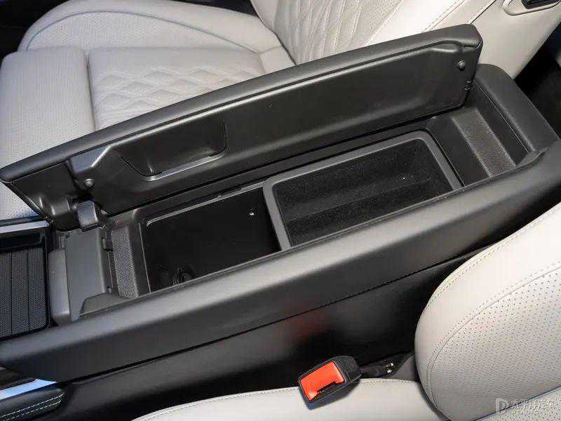 中控台下方配有可翻转杯架设计,设计了两个杯托可以单独控制打开关闭,打开时作为杯托,关闭时变为储物盒。其次中扶手箱分区设计,上层采用可滑动可拆卸多功能储物盒,且内部设计植绒,可以放眼镜等需要防摩擦的小物品,下层保留较大空间,可以放纸抽,平板电脑等较大物品。