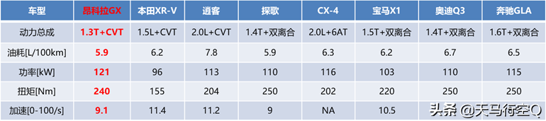 首先介绍下这款发动机的性能,全新昂科拉GX配有两种动力系统,分别是两驱车型1.3T+CVT和四驱车型的1.3T+9AT组合。我借的是两驱顶配,它搭载了1.3T三缸发动机,其最大功率165马力/5600rpm,最大扭矩240Nm/1500-4000rpm。这款发动机与GL6和英朗上的1.3T有不同,那两款发动机是D-PFI(双歧管喷射)系统,而昂科拉GX上使用的是一套35MPa的DI(直喷)系统,由于大负荷下燃油雾化效果更好,燃烧更加充分,且缸内直喷对气缸冷却效果更好一些,极限工况下进气量可以多一点点,所以性能略高。
