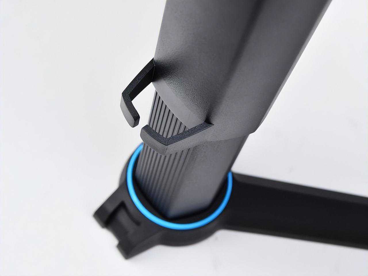 另外支架后方有单独设置的束线孔,方便用户整理收束线材,保证桌面整体美观协调,底部的蓝色装饰环点缀,既不显得突兀,又契合了背部的设计,可谓神来之笔。