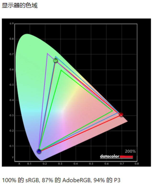 首先是色域测试,根据SpyderXElite软件的测试结果显示,HKCVG253KM显示器sRGB色域的覆盖度为100%,AdobeRGB色域的覆盖度为87%,P3色域的覆盖度为94%,基本符合官方宣传水平。