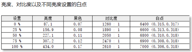 色温一致性方面,这款显示器的白点色温在6400K-7000K之间,色温随亮度有波动,对比度达到了2610:1。