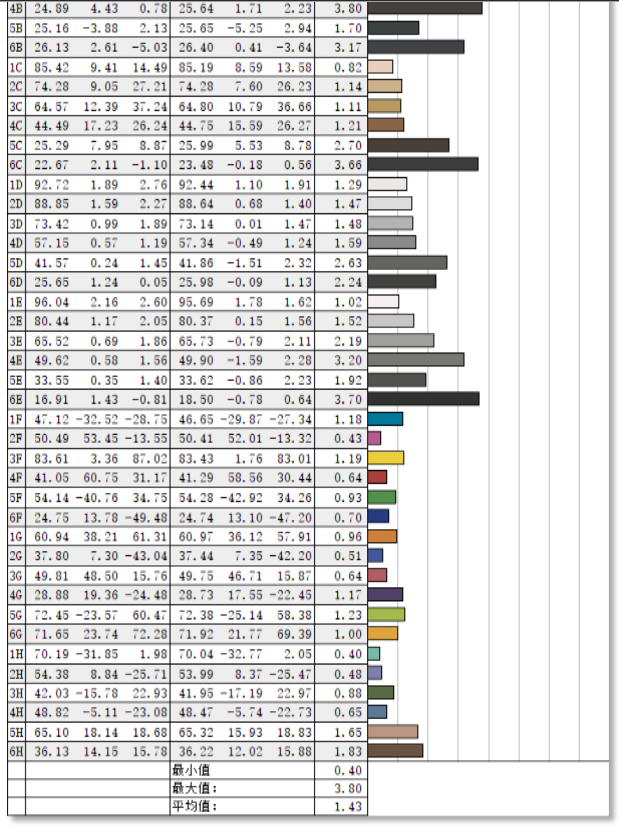 色彩精准度的测试中,HKCVG253KM显示器结果为平均△E值为1.43,色彩还原十分精准,一般来说△E值小于2肉眼几乎看不出色彩方面的差异,HKCVG253KM的表现基本符合大部分游戏玩家需求。