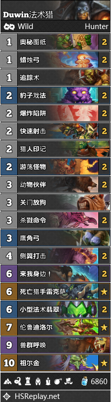中速猎虽然如今在标准环境之中十分流行,但是到了狂野,这一卡组还只是处于襁褓期。在对狂野公开赛的展望之中,许多标准玩家都希望能把这一卡组引入狂野。Jakaso27的构筑目前最为流行,许多玩家都使用这套构筑打到了传说高位。
