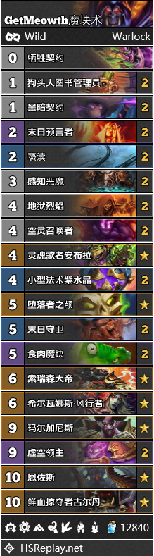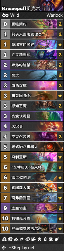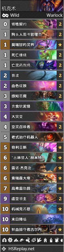 T1俱乐部中来了一个新成员:机克术。由于许多标准玩家的加盟,机克术的优化进程也大大提速。依靠着术士的移除手段和虚空召唤者组件包,机克术在对阵各种快攻卡组时的表现十分出色,不过碰上海君贼和偶数术就显得十分无力。