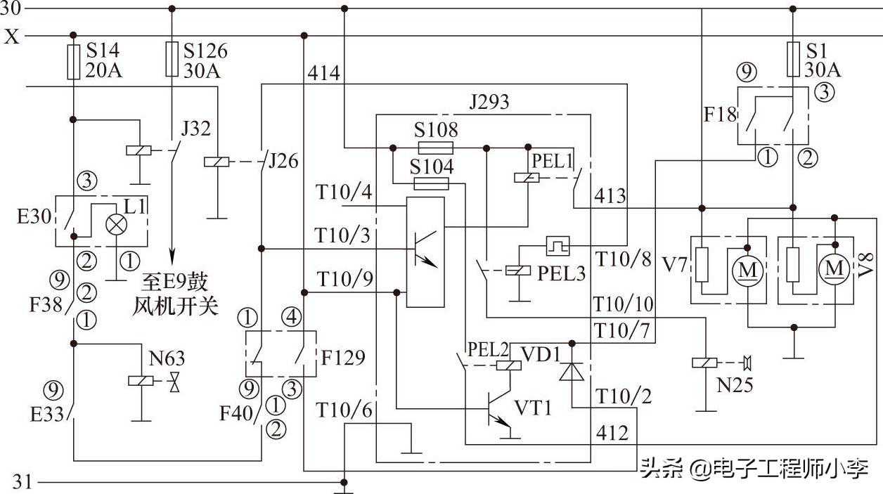 上述电流通路使PEL2触点闭合,通过30号电源线、散热器风扇高速挡熔断器S104、PEL2触点向V7、V8供电,使散热器风扇高速运转。