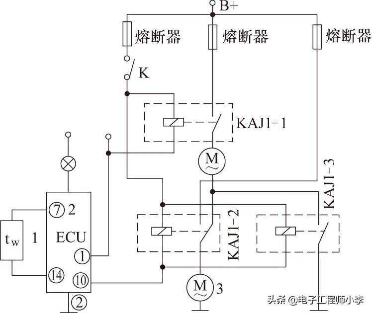 在图1-10电路中,由水温传感器1,水温电子控制器2和3个风扇控制继电器KAJ1-1、KAJ1-2、KAJ1-3及2个风扇电动机构成了该系列轿车的冷却散热系统。在该系统中,KAJ1-1~KAJ1-3是一只组件内封装的三个继电器,它们分开画在不同的控制电路中,用KAJ1来将它们联系起来属同一个继电器,而用KAJ1-1表示是KAJ1继电器中的第1个继电器,用KAJ1-2表示是KAJ1继电器中的第2个继电器,用KAJ1-3表示是KAJ1继电器中的第3个继电器。