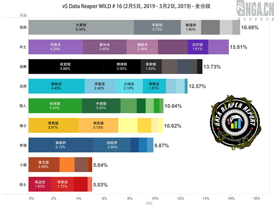 牧师在成为了5级以下分段中最热门的职业。这其中,大哥牧一马当先,在低分段占据了接近10%的份额。其他的牧师卡组还包括宇宙牧,在标准环境大热的墙牧,还有心火或者心爆变种的各式龙牧。而到了高分段,牧师的出场率就迅速跳水,在全职业中仅仅排到第四。