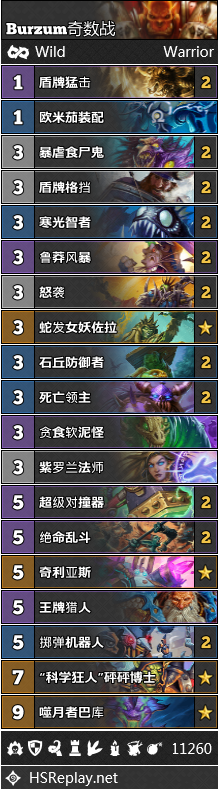 让我们的目光从极速快攻转到慢速疲劳,在这边我们就可以看到奇数战。这个卡组目前具有T3的强度。你想要一网打尽所有快攻卡组?那么天梯上除他之外便并无二家。单从这点上来看,奇数战的表现应该相当不错才是。然而事实并非如今,因为天梯上还充斥着各种能一波带走对面的慢速套路。比如说机克术的崛起就让奇数战十分绝望,而像大哥牧或者魔块术这样的超展开卡组也让奇数战难以招架。这些邪门套路的存在严重拉低了奇数战的胜率,奇数战这辈子都不希望在天梯上见到他们。