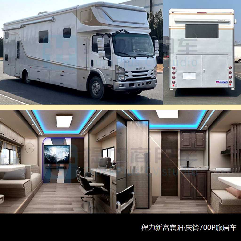 程力新富目前在个性化定制领域也开展了很多尝试,本批采用庆铃700P系列QL1110ANPAY二类底盘申报了CXF5110XLJQ6旅居车,全长9.6米、轴距5.2米,车高3.38米相当于团体性质的低车身座位客车,方舱带C型额头、额定载客3人,左侧布置沙发、卡座和厨具区,右侧沙发可与左侧组成折叠双人睡具,后轮后右侧单乘客门,左、右两侧可选拓展装置。此车比较有特点的是尾部单独设置卫生设施区域,利用高度差形成错位布局,同时借助对开式尾门进行水箱操作。该车GVW=10.55吨、整备质量10.15/10/9.65吨,采用前8后10+6片板簧悬挂,搭载五十铃中国5.2L、190或205马力柴油机,最高车速110km/h。