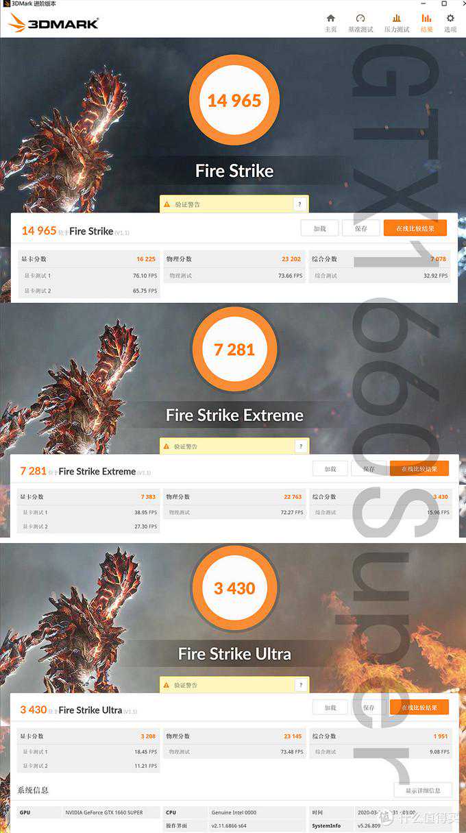 ▼3DMarkFireStrike,截图为GTX1660Super数据。