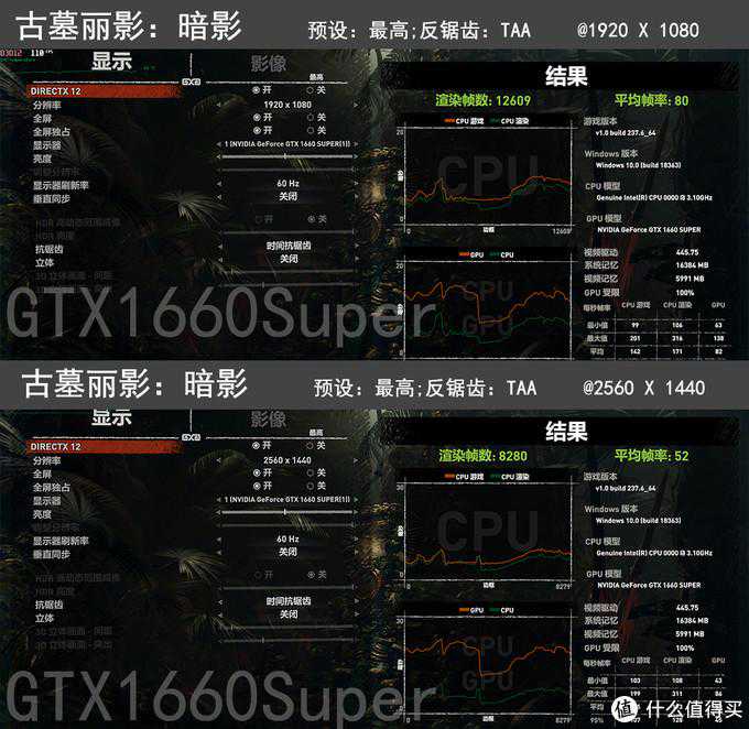 ▼DX12游戏,暗影在最高预设下,GTX1660Super在1080p分辨率平均帧数达到了80fps,1440p(2k)分辨率平均帧数达到了52fps,勉强流畅。