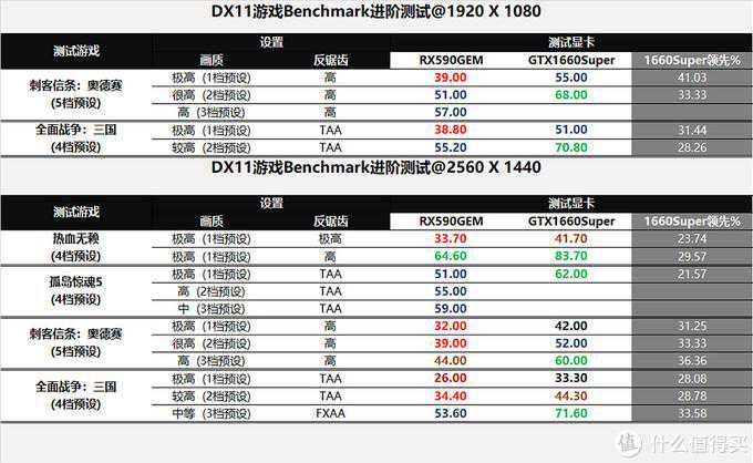 ▼1080p分辨率下,奥德赛和三国,两款显卡在最高画质下均没达到60帧以上,GTX1660Super的在50fps以上,其实也算是流畅了,如果要求较高,降低一档画质帧数可达到接近70fps;由于奥德赛是个A黑的游戏,RX590GME降低2档画质才勉强接近60fps,三国降低一档画质后也只达到了55fps。