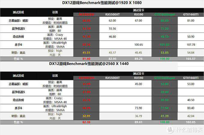 以GTX1660Super为100%计,3DMarkFireStrike(DX11)中,A卡阵营与N卡阵营差距不大,RX590还要高于两款N卡;TimeSpy(DX12)中N卡完成反超,GTX1660Super领先A卡大概22~25%;UNIGINESUPERPOSITION测试中,GTX1660Super领先A卡三张显卡大概在11~17%。另外N家的两款显卡差距只有4~7%。