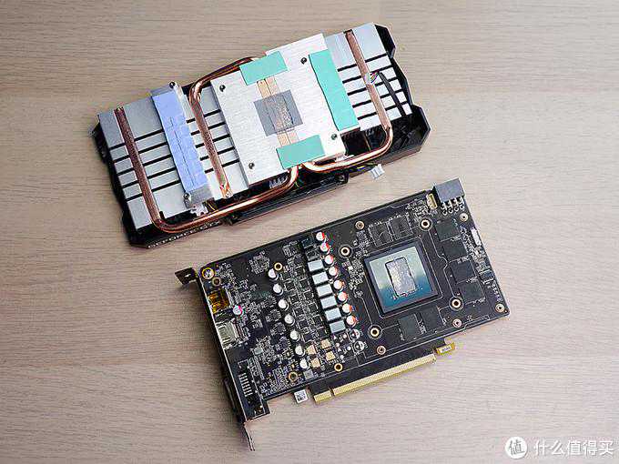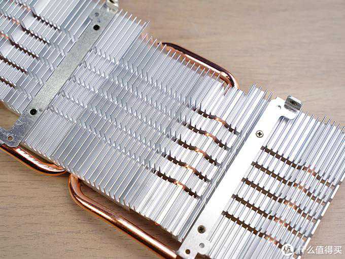 ▼拆解后可以看到显卡采用了双热管,热管直触显卡核心,两个热管一个成S形,一个为U型,显然S形的热管要比常规热长很多,提高了换热效果。另外显存以及mosfet上都覆盖有导热垫,与散热器贴合来达到散热的目的。