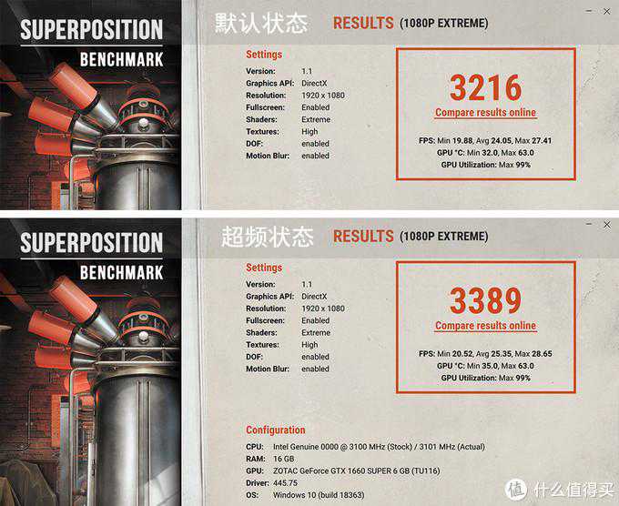 ▼UNIGINESUPERPOSITION的1080PEXTREME超频前后数据对比。