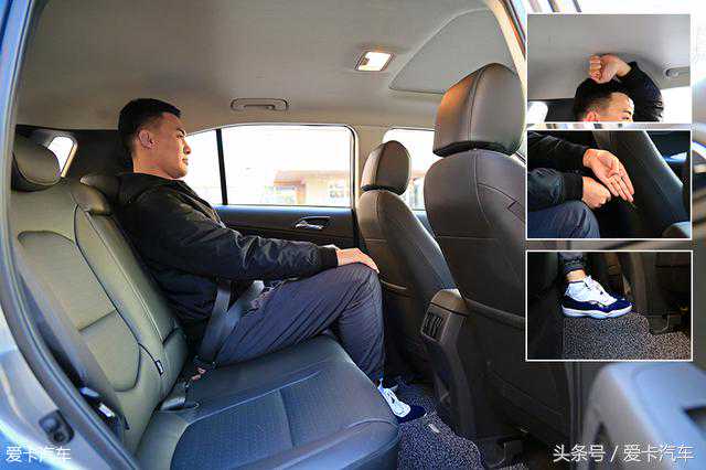 前排为体验者坐姿,此时后排可获得一拳的头部空间和一拳四指的腿部空间,中间通道地板有5cm左右的隆起,但对实际乘坐空间影响不大。
