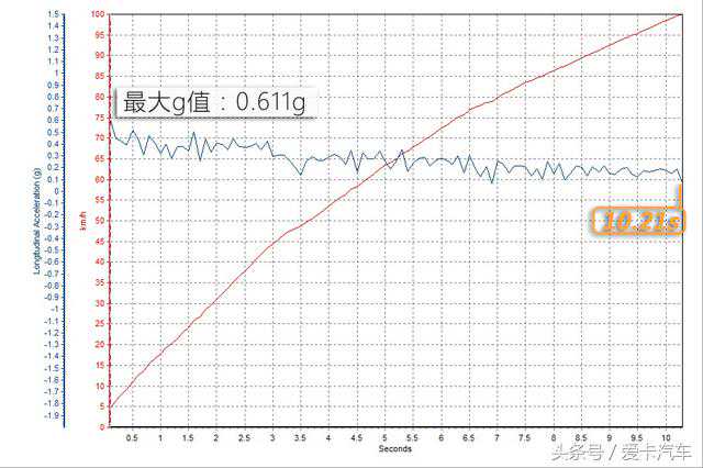 最终测得的0-100km/h加速成绩为10.21s,最大加速g值可在加速伊始达到0.611g。