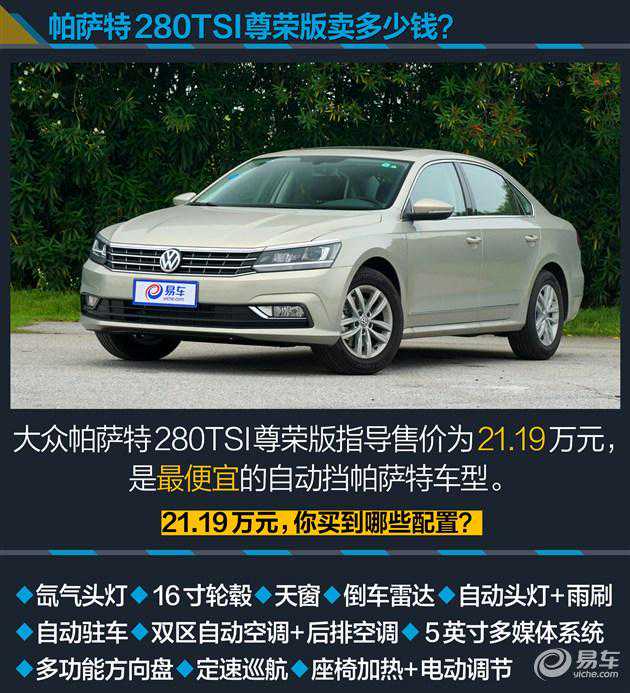 对于购买大多数中级车的消费者,更多的会选择2.0/2.4升自然吸气发动机,或1.8T/2.0T涡轮增压发动机,大众家族的1.4T发动机或许和消费者们传统思想中的中级车身份并不相符。现在编辑手中就有一辆1.4T排量的大众帕萨特,取名为280TSIDSG尊荣版。名字听起来已经很好听了,但或许你认为它的动力要差点,低价也会牺牲更多的配置,那么它的实际表现会是怎样呢?我们接着看。