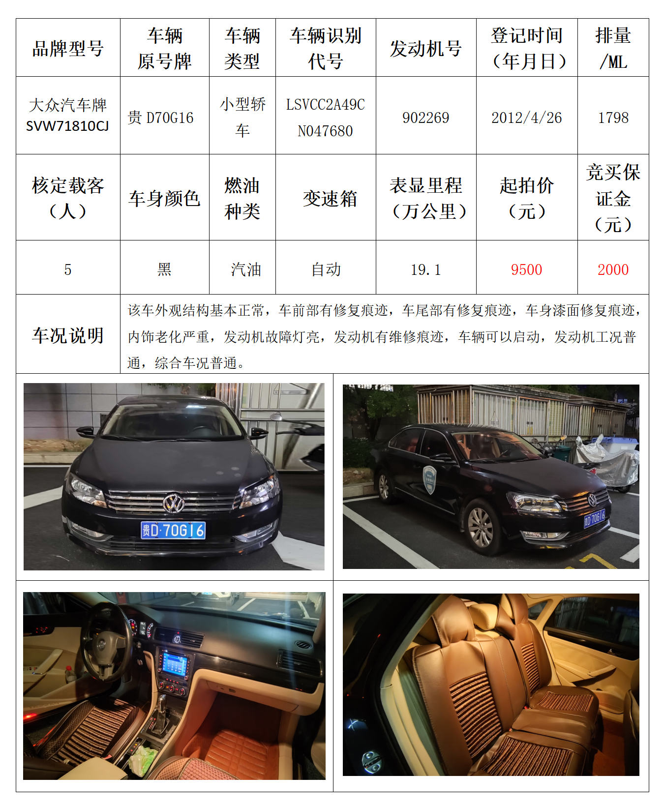 拍品编号5:大众汽车牌SVW71810CJ小型轿车一辆