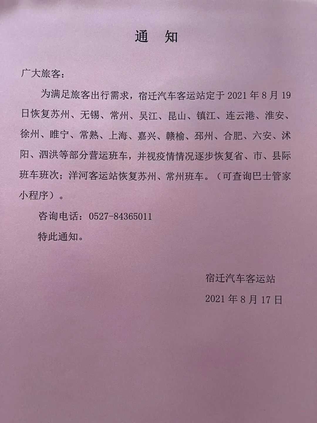 宿迁汽车客运站定于2021年8月19日恢复苏州、无锡、常州、吴江、昆山、镇江、连云港、淮安、徐州、睢宁、常熟、上海、嘉兴、赣榆、邳州、合肥、六安、沭阳、泗洪等部分营运班车,并视疫情情况逐步恢复省、市、县际班车班次;