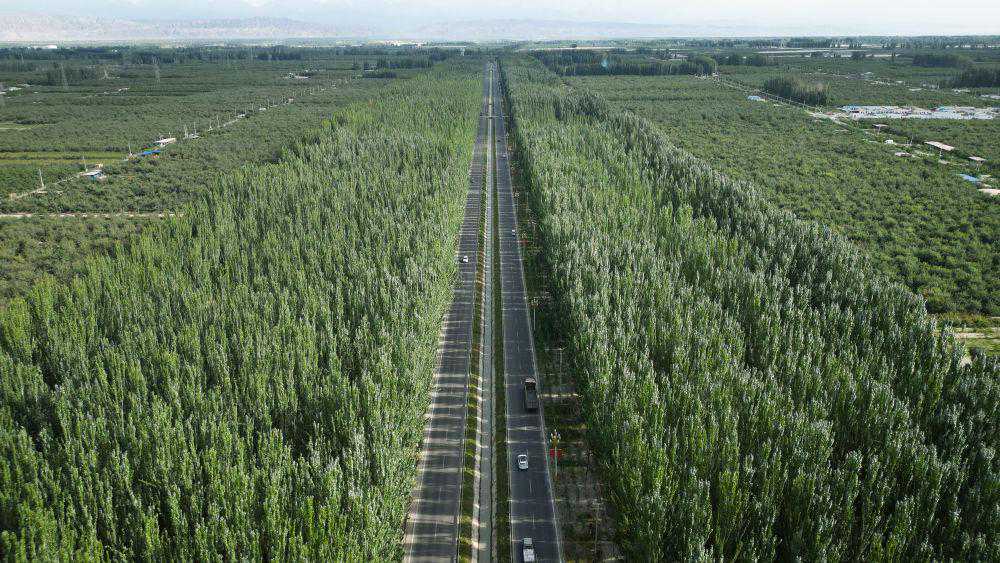 在新疆柯柯牙,当地政府推行以林果业为主的“谁建设、谁管护、谁投资、谁受益”荒漠绿化造林模式,在防护林网中套种苹果、核桃、红枣等经济林,延续生态成果。