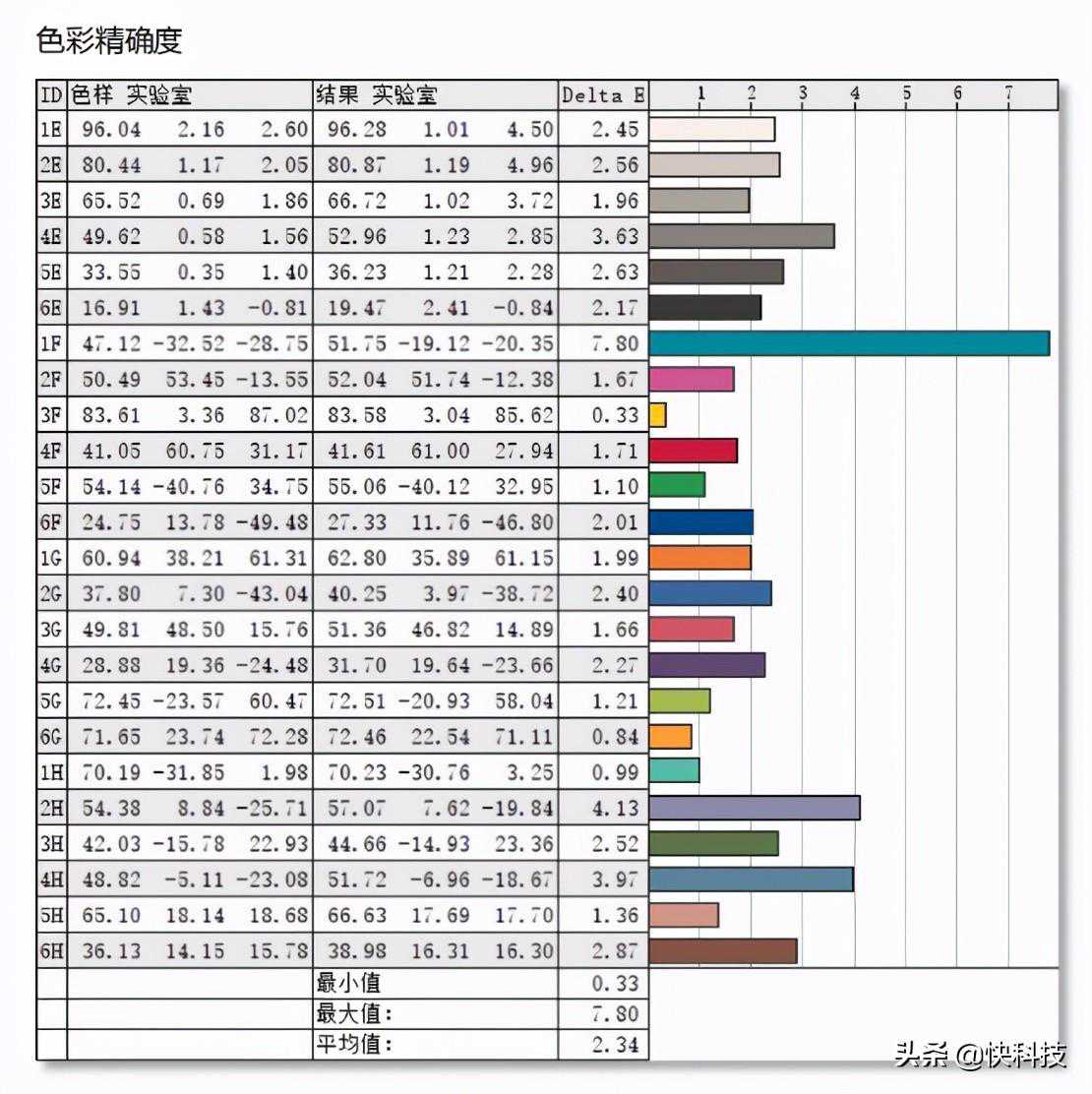 色差平均值为2.34,一般认为3以内即优秀,5以内即肉眼无法分辨出色彩的差异,这块屏幕的色准也算是达到了优秀的门槛。