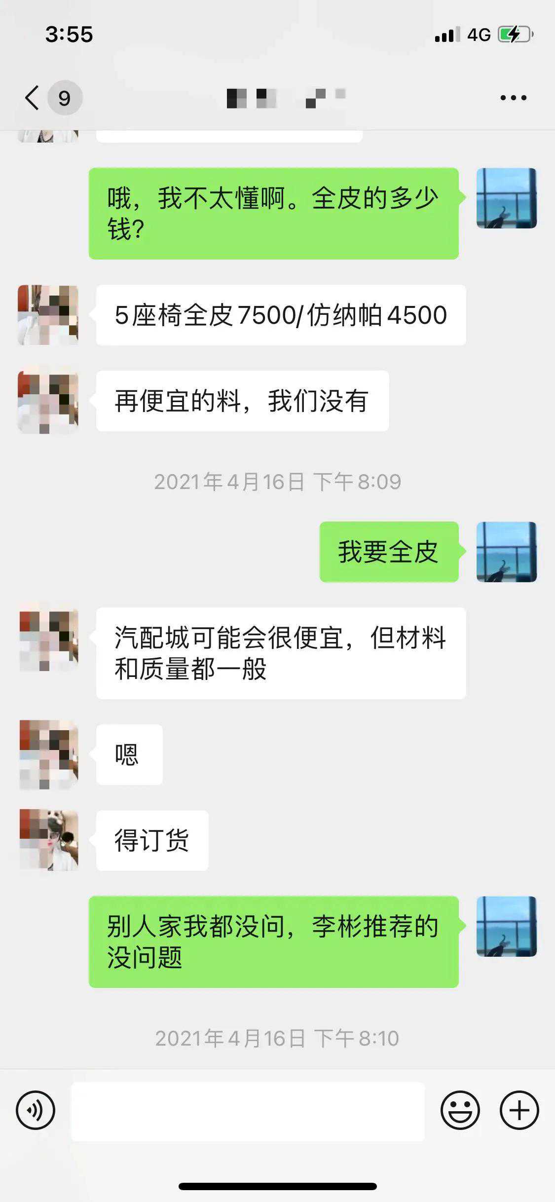 接下来就要选择包真皮的厂家了,厂长给我推荐了两个,一个是五方天雅的商户干了十几年,优势是价格。另一个是高端一点儿的,缺点是价格。我说你给我个微信吧我聊聊再说