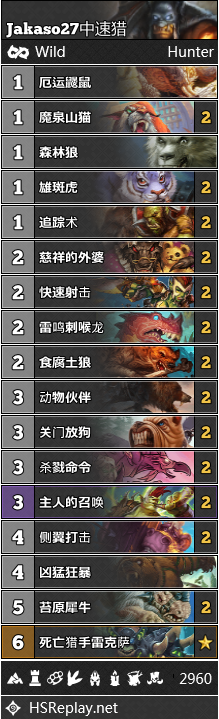 中速猎虽然如今在标准环境之中十分流行,但是到了狂野,这一卡组还只是处于襁褓期。在对狂野公开赛的展望之中,许多标准玩家都希望能把这一卡组引入狂野。Jakaso27的构筑目前最为流行,许多玩家都使用这套构筑打到了传说高位。