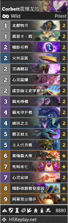 震爆龙牧的实力在上期月报中已经初现端倪。在平衡补丁之后,他也照常开张营业。类似于核弹变种的宇宙牧,震爆龙牧也可以一波爆发结束比赛,但却不需要受到宇宙卡组的限制,每张关键卡牌都可以带上两张。也正因为如此,他的表现更为稳定,基于小样本的估算,他的强度差不多能有T2的水平。一些狂野的高端玩家,像是Corbett,都被这一卡组的诱人香气勾引而来。至少从数据上来看,这一卡组的味道应该确实不错。