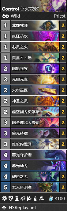 心火龙牧可能是这份月报中最大的惊喜所在了。过去,这一卡组一直疲于应对各种铺场向的快攻卡组。而如今,心火龙牧似乎已经成功开疆辟土,在平衡补丁后的环境之中找到了立足之地。虽然这一卡组的出场率还相当的低,但是小样本数据显示,他竟然能有T1的强度,远远优于他过去的表现。为什么心火龙牧一下子就窜上了T1呢?也许这是因为如今随处可见的黑曜石雕像和虚空领主,都可以被暮光侍僧+疯狂药水拉拢过来,成为发动斩杀的施法材料之一。如果环境继续降速,心火龙牧就能有更多的时间准备启动组件,那么他的表现也就能更上一层。