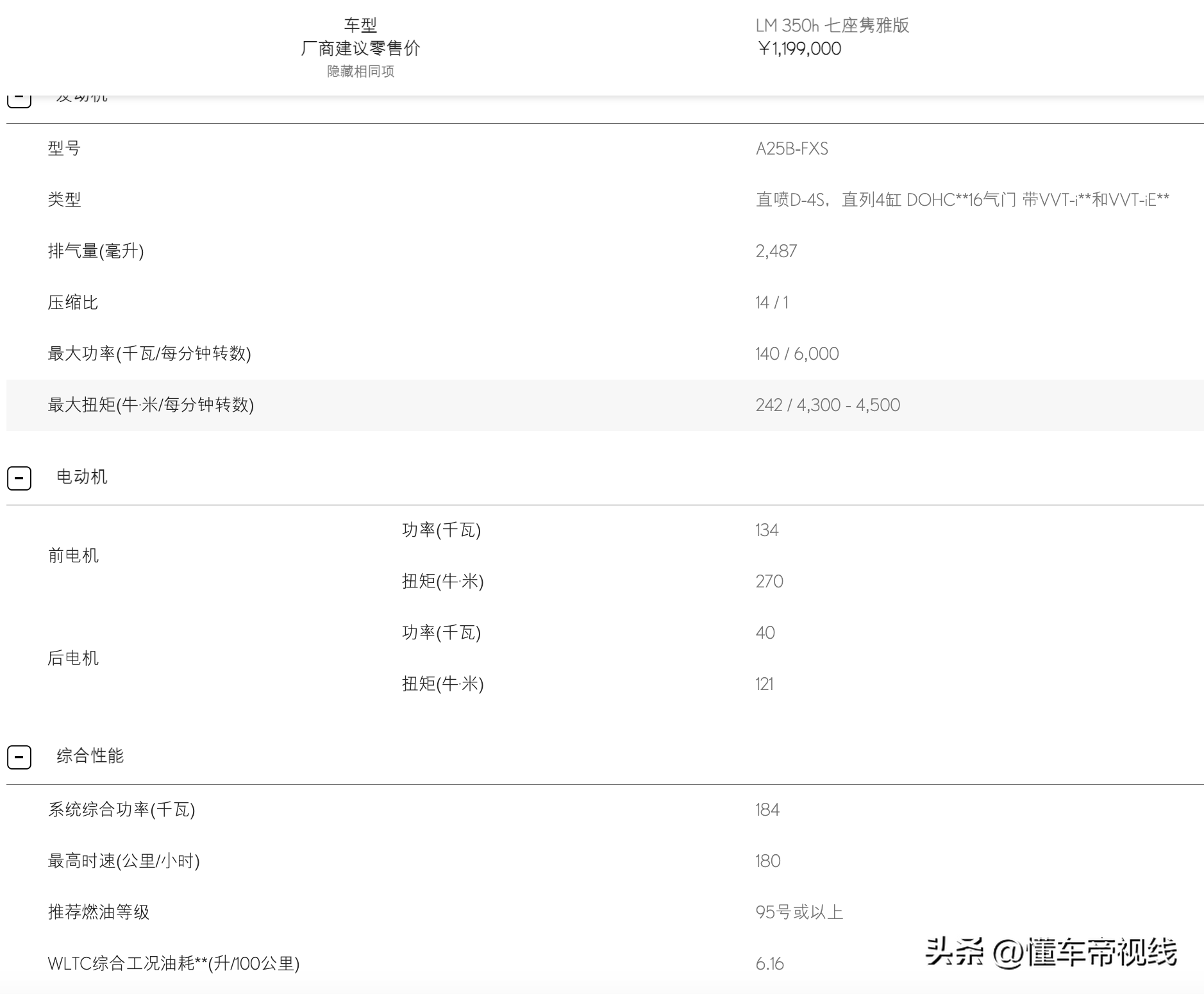 350h版本综合最大功率184千瓦,相较老款车型300h参数有所提升,车辆最高车速为180公里/小时,WLTC综合百公里油耗为6.16升。
